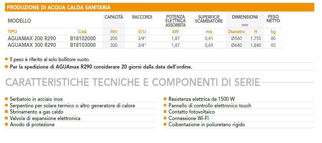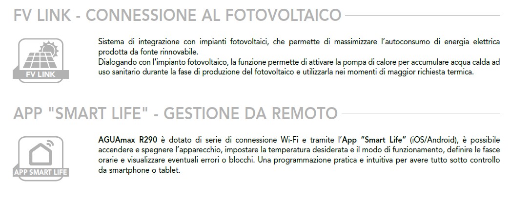 AGUAmax R290 è un preparatore di acqua calda sanitaria, ad accumulo, riscaldato da pompa di calore con refrigerante naturale R290, integrata nel mantello con connessione Wi-Fi e gestione tramite App “Smart Life”.