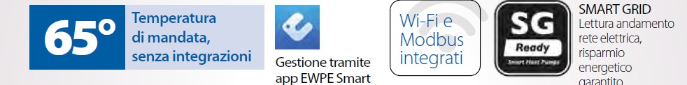 | Soluzioni | Raffrescamento, Riscaldamento, Acqua calda sanitaria, Raffrescamento + Riscaldamento + ACS, Riscaldamento + ACS |