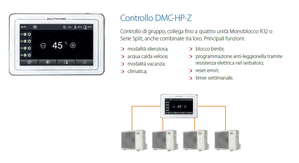 | MW split con idromodulo | Controllo di gruppo, collega fino a quattro unità Serie Split e Monoblocco DMC-HP-Z, Unità esterna MCENGS 1000 Z + Unità interna MHNGS 800-1000 Z 10kW, Unità esterna MCENGS 1200 Z + Unità interna MHNGS 1200-1600 Z 12kW, Unità esterna MCENGS 1400 Z + Unità interna MHNGS 1200-1600 Z 14kW Trifase, Unità esterna MCENGS 1600 Z + Unità interna MHNGS 1200-1600 Z 15,5kW Trifase, Unità esterna MCENGS 600 Z + Unità interna MHNGS 400-600 Z 6kW, Unità esterna MCENGS 800 Z + Unità interna MHNGS 800-1000 Z 8kW |