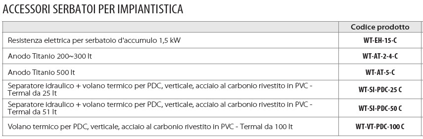 | MW serbatoi e accessori | Anodo Titanio 200-300 lt cod. WT-AT-2-4-C, Anodo Titanio 500 lt cod. WT-AT-5-C, Resistenza elettrica per serbatoio d'accumulo 1,5 kW cod.WT-EH-15-C, Separatore idraulico + volano termico per PDC, verticale, acciaio al carbonio rivestito in PVC – Termal da 25 lt cod. WT-SI-PDC-25 C, Separatore idraulico + volano termico per PDC, verticale, acciaio al carbonio rivestito in PVC – Termal da 51 lt cod. WT-SI-PDC-50 C, Volano termico per PDC, verticale, acciaio al carbonio rivestito in PVC – Termal da 100 lt cod. WT-VT-PDC-100 C, WT-XL-DW1-300C-1 serbatoio 300l, WT-XL-DW1-500C-1 serbatoio 500l |