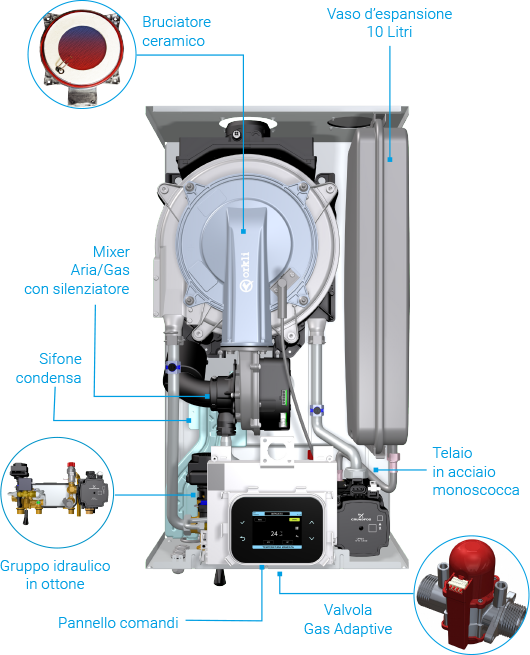 La caldaia Idrogenius adotta il sistema di gestione della combustione gas adaptive MOTORE TERMICO che ha nel bruciatore ceramico CERAMAT il suo cuore. Meno consumi, più efficienza, meno emissioni
