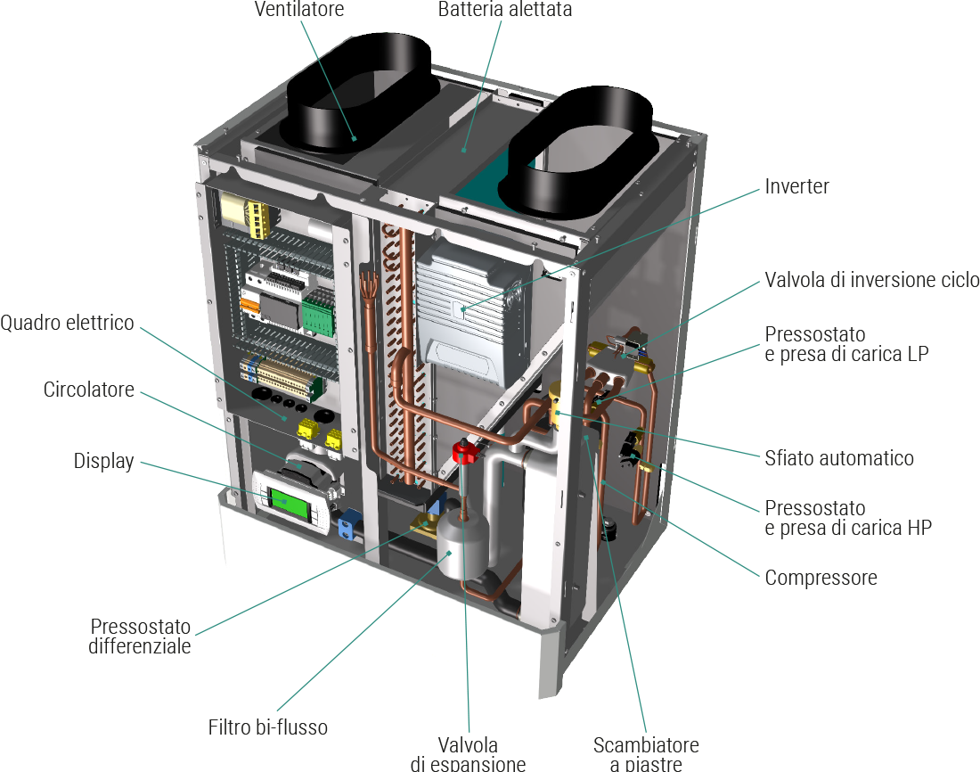 Innovativa pompa di calore Aria – Acqua adatta per l’installazione all’interno. L’unità è dotata di un ventilatore centrifugo EC ad elevate prestazioni e che garantisce una limitata rumorosità. Le unità sono state pensate per nuove costruzioni e ristrutturazioni dove è importante non modificare le qualità estetiche degli edifici (palazzi storici, vincoli architettonici, ecc.) e in unità dove gli spazi interni sono ridotti.