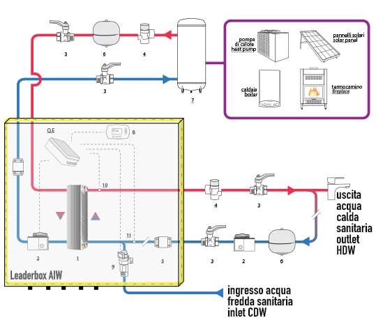 Leaderbox AIW viene connessa al puffer primario e produce istantaneamente il fabbisogno richiesto di acqua calda sanitaria.